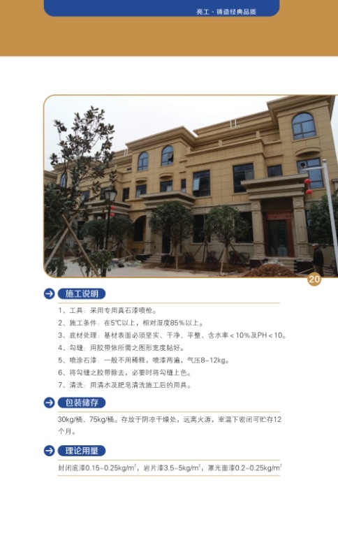 選用真石漆噴槍,空氣壓力控制在4- 7千克/平方厘米,施工溫度5C以上,厚度約2- -3mm,如需涂抹兩道、三道,則間隔2小時,干燥24小時后方可打磨。